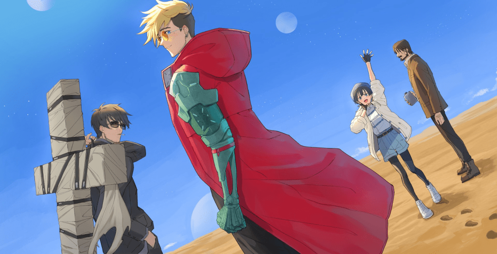 This show is really fun when it starts. In the far future, Earth became uninhabitable, forcing humanity to evacuate in massive colony fleets in search for habitable planets. One colony crash lands and eventually settles on a desert-like planet. A hundred years after the crash, we follow an outlaw named Vash the Stampede. It’s a cool setting that reminds me of Cowboy Bebop, both Western and Sci-fi. I love that combination.