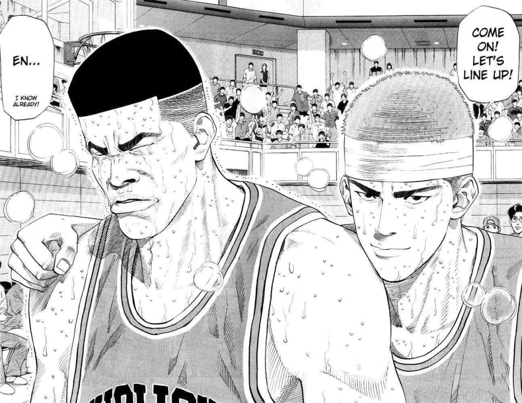 What I love about this series is each player has their own story and reason for playing basketball. Inoue does a great job of developing them. Not just with flashbacks but also as the series progresses. Sakuragi becomes a more serious person through each game. As Inoue starts building up his characters, he then bounces them off each other. In a loss, Akagi comforts Sakuragi, who’s crying as he thinks they lost because of him. Then, in the next game, it reverses, and Sakuragi comforts Akagi, who’s crying because he’s overwhelmed with joy after finally making it to nationals.