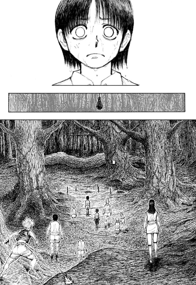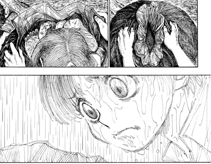 Togashi continues to show his mastery of the art form with the panels above. He leans into heavily detailed images with the first two panels, highlighting the gruesome nature of the dismembered body parts. Then, he transitions to Chrollo, where the sketched lines of his face show how terrible this scene is for him to witness.